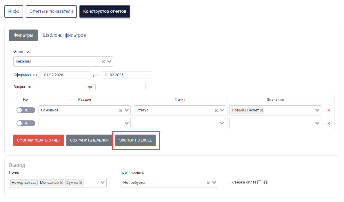 В Конструктор отчетов (Личный кабинет → Конструктор отчетов) добавлена выгрузка отчета в Excel. Это позволяет выгрузить все данные в файл ещё на этапе конструирования отчета без необходимости сохранения шаблона отчета и перехода на другую страницу для его формирования.