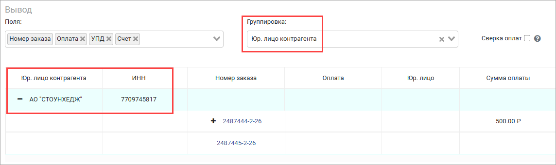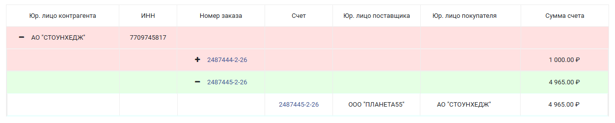 Если строки сгруппированы по какому-либо параметру, то соответствующим цветом закрашивается заглавная строка группировки. Если все заказы в группе успешно прошли сверку оплат, то строка закрашивается зеленым цветом, если сверка хотя бы одного заказа не пройдена - красным.