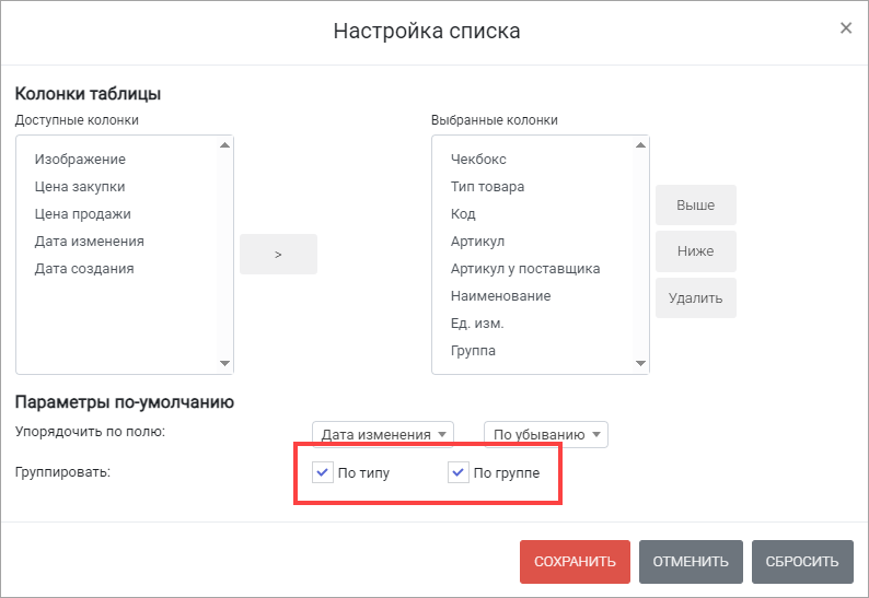 В реестре Номенклатура в меню Настройки списка добавлены настройки группировки По типу и По группе.