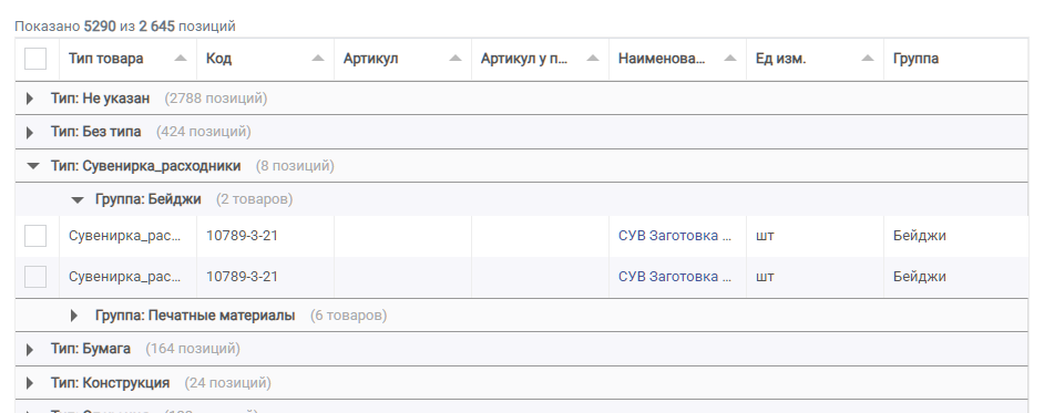 Если включена одна из настроек, то номенклатура группируется по указанному параметру в группы с заголовком в виде названия типа/группы. Номенклатура без параметра (типа или группы) объединяется в группу с заголовком Не указан.