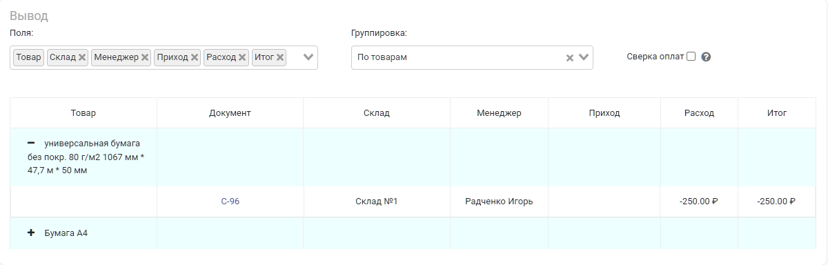 В свернутом виде в строке каждого товара отображаются только итоговые суммы. В развернутом виде отображаются строки с документами, в которых встречается данный товар.