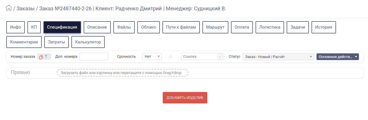 В карточке заказа на вкладке Спецификация при отсутствии изделий убрана возможность выбора маршрута. При этом отображается кнопка добавления изделия.