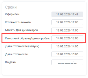 Так как в карточке заказа на вкладке Инфо поле с датой готовности спуска не использовалось, то мы переименовали его в более актуальное Пилотный образец/цветопроба к:.